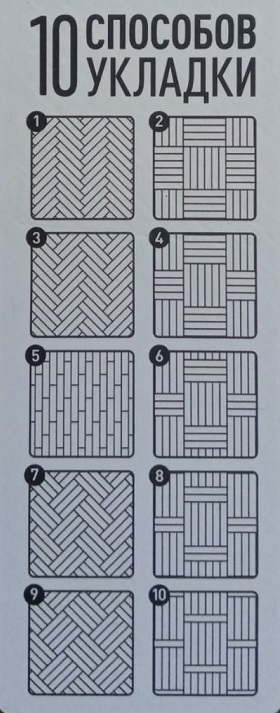 Небольшое размер доски 600*100*10 мм, а также наличие в упаковке 13 правых досок и 13 левых позволяет осуществить укладку не только стандартным вариантом (хаотичная палуба), а также и "елочка", "квадраты" и пр. Также вы можете комбинировать различные декоры данной коллекции, что позволит получить практически художественный паркет. Воплощайте свои мечты...