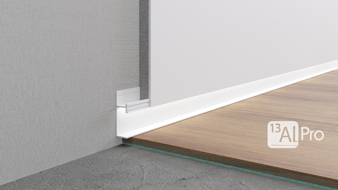AluminiumPro Теневой плинтус скрытого монтажа AlPro13-7210 с нижней полкой БелыйМУАР(под подсветку) 2.7 м.