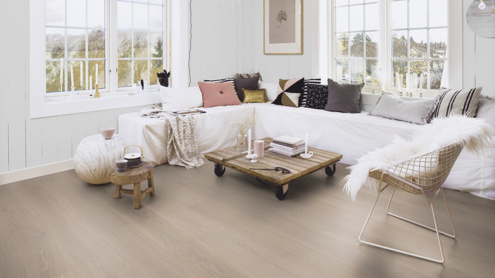 Паркетная доска дуб белый Andante 209 мм браш, фаска, лак Live Pure