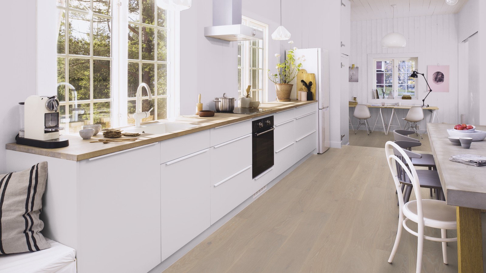 Однополосная паркетная доска дуб Grey Harmony 209 браш, фаска, покрытие Live Pure. Благодаря специальной обработке напольного покрытия, Live Pure представляет собой поверхностный слой, который защищает пол от пыли, грязи, жидкостей и химических веществ, хотя в то же время пол выглядит и ощущается как необработанная или отшлифованная сырая древесина. Поверхность, обработанная Live Pure, также отличается лучшей устойчивостью к УФ лучам, чем стандартные покрытия из лака и масла. После укладки пола и во время его использования не требуется никакой дополнительный уход.